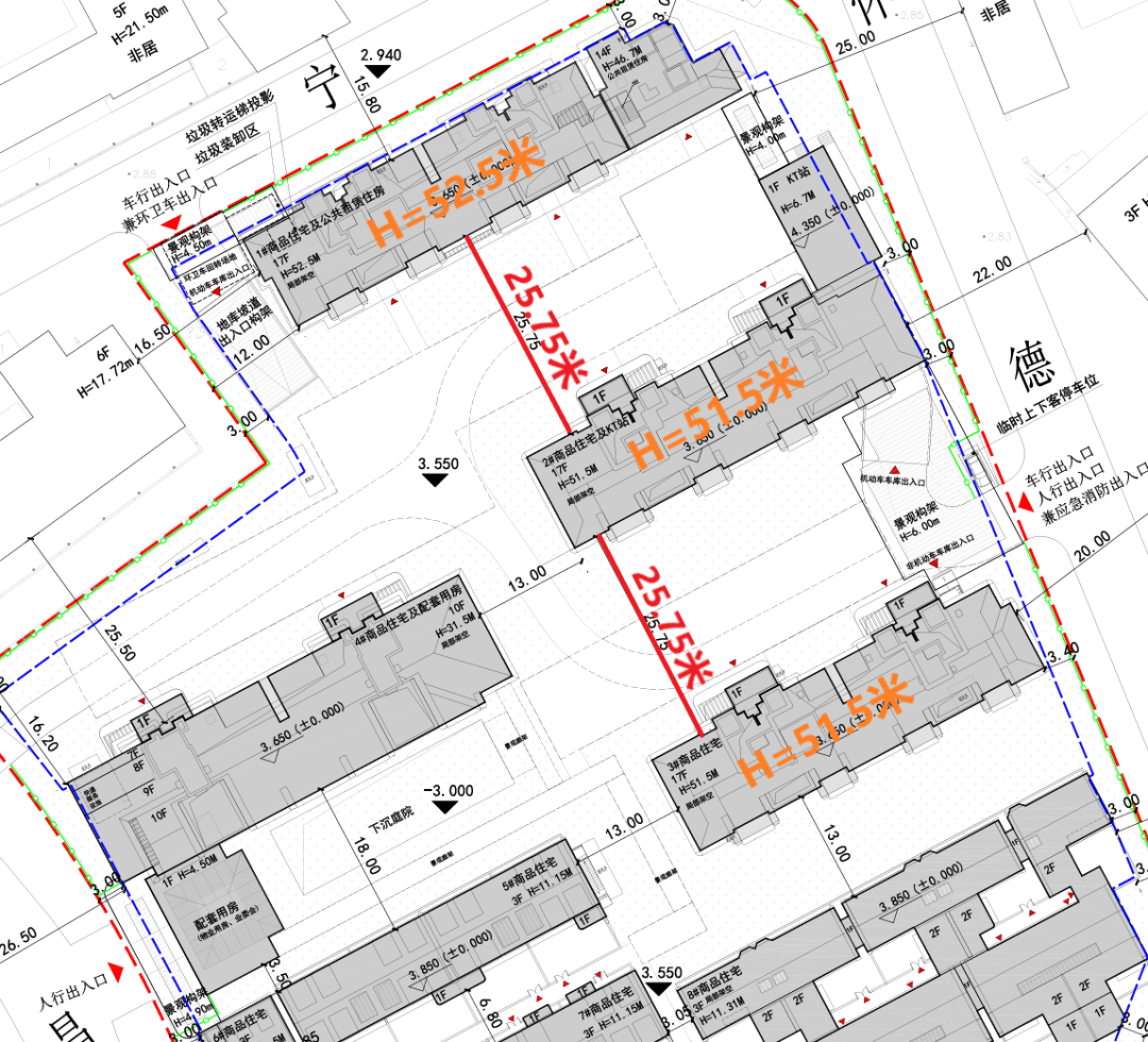 例如,社区东侧的3栋(1#、2#、3#)17F高层,高度在51.5-52.5米,而楼间距仅有25.75米,比例接近1:2。