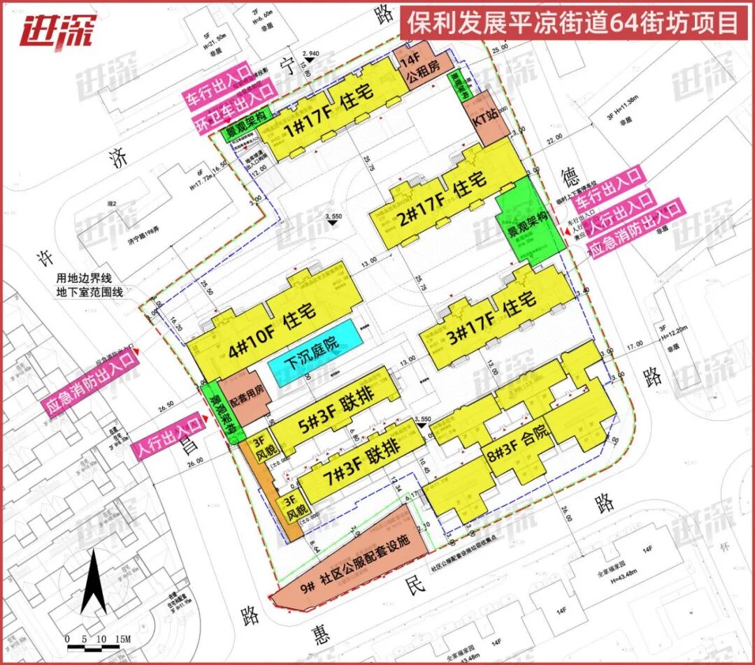 1#、2#、3#楼均为17层高层住宅,首层局部架空,可用作泛会所,1号楼东侧是1幢14层的公租房;4#楼为10层的洋房产品,以及部分配套;5#、6#、7#、8#楼均为风貌别墅产品;9#楼为社区公共服务配套用房。