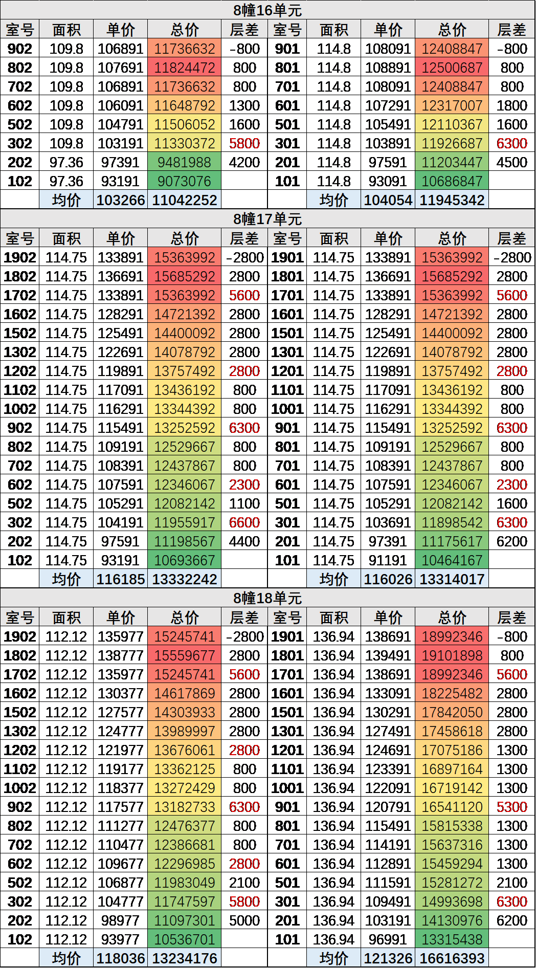 5#楼01单元整列均价109037元/㎡,高于8#楼01单元整列均价104054元/㎡。