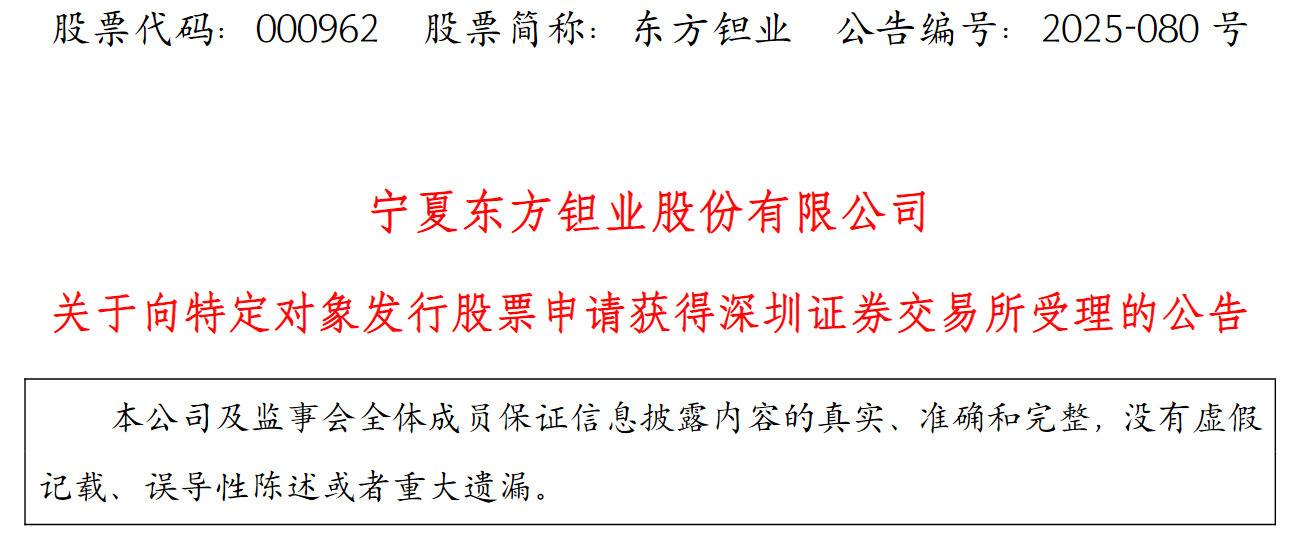 东方钽业(000962.SZ)于10月9日发布公告,宣布其最新定向增发申请已获深交所正式受理,后续尚需通过深交所审核并取得证监会同意注册的决定。
