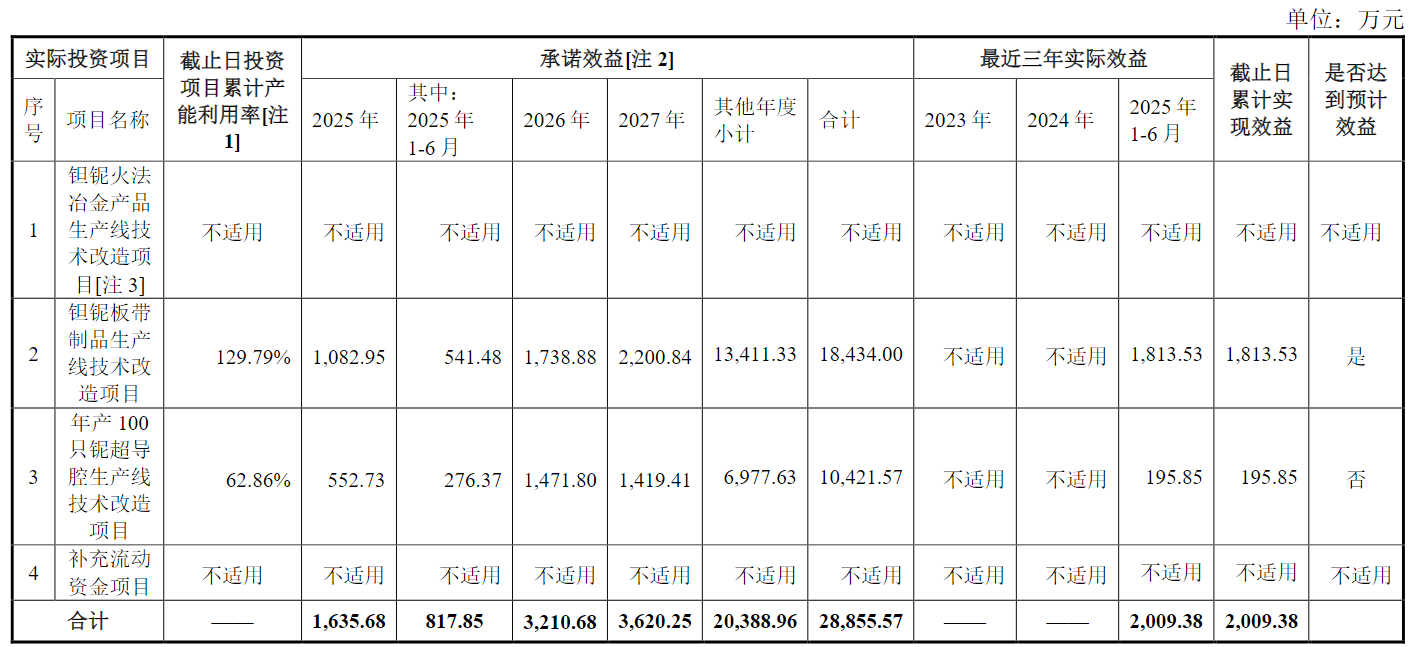但与之形成对比的是,铌超导腔技改项目的产能利用率仅为62.86%,上半年实际收益195.85万元,累计实际效益低于承诺效益20%以上。公司解释这一差异主要源于铌超导腔生产周期较长,大部分产品尚处于生产加工期,未能完成实际交付。同时,截至2025年中报,钽铌火法冶金产品生产线技术改造项目尚未完全建成,显示出项目推进过程中的实际难度。