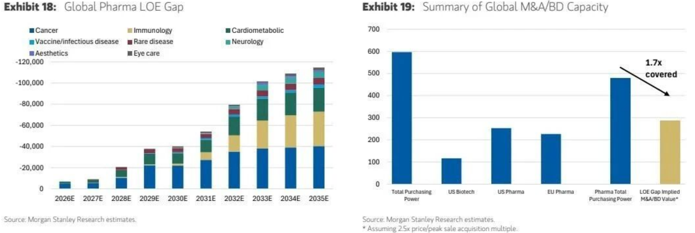 图片说明:欧美MNC专利到期的潜在损失越来越大,同时欧美MNC具有充足的并购/BD资金,数据来源于摩根士丹利