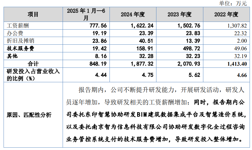 此外,研发投入的持续加码,为公司的技术创新注入了源源不断的动力。2022年至2025年上半年,公司研发投入分别为1413.40万元、2070.93万元、1877.32万元和848.19万元,占营业收入的比例分别为4.66%、5.62%、4.75%以及4.44%。从研发构成来看,工资薪酬是主要支出,2024年、2025年上半年分别达1622.24万元、777.56万元,反映出公司对核心研发人员的重视。