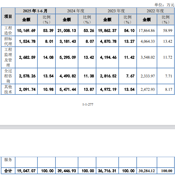 业绩增长的背后,是公司业务的精准拓展与核心优势的持续释放。作为第一大主营业务,工程造价业务收入占比始终超50%且金额逐年提升,这一成绩的取得主要得益于公司在该领域技术与服务的不断优化以及在区域市场的深耕细作。
