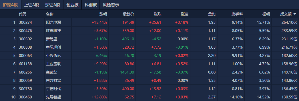 个股方面,阳光电源成交额超264亿元居首,胜宏科技、新易盛、中际旭创成交额靠前。