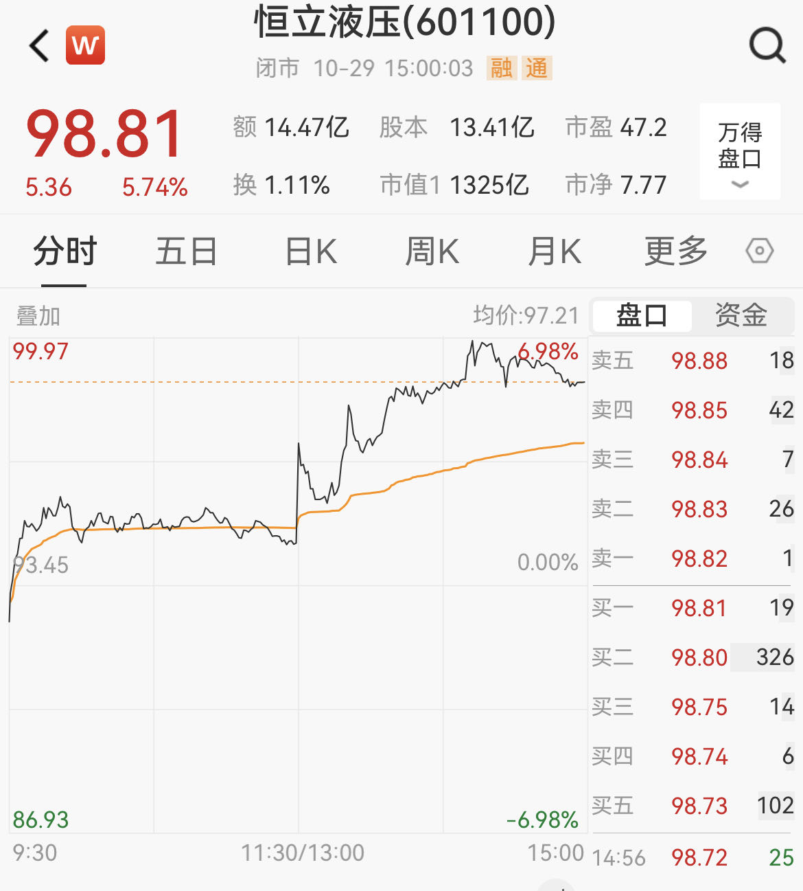10月29日,液压元件龙头企业恒立液压(601100.SH)午后突发异动,股价直线拉升,盘中最高涨幅达6.98%至99.97元/股,截至收盘报98.81元/股,涨幅5.74%,总市值达1325亿元。