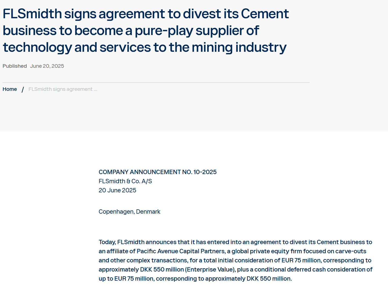 图片说明:FLSmidth剥离水泥业务,信息来源于官网