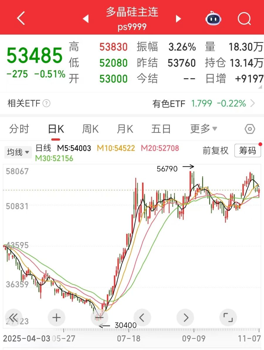 数据显示,多晶硅期货6月底以来走出一波大涨行情。截至11月6日收盘,多晶硅主连期货(PSZL)从6月25日开盘的31085元/吨上涨71.77%至53397元/吨,近期维持高位震荡。
