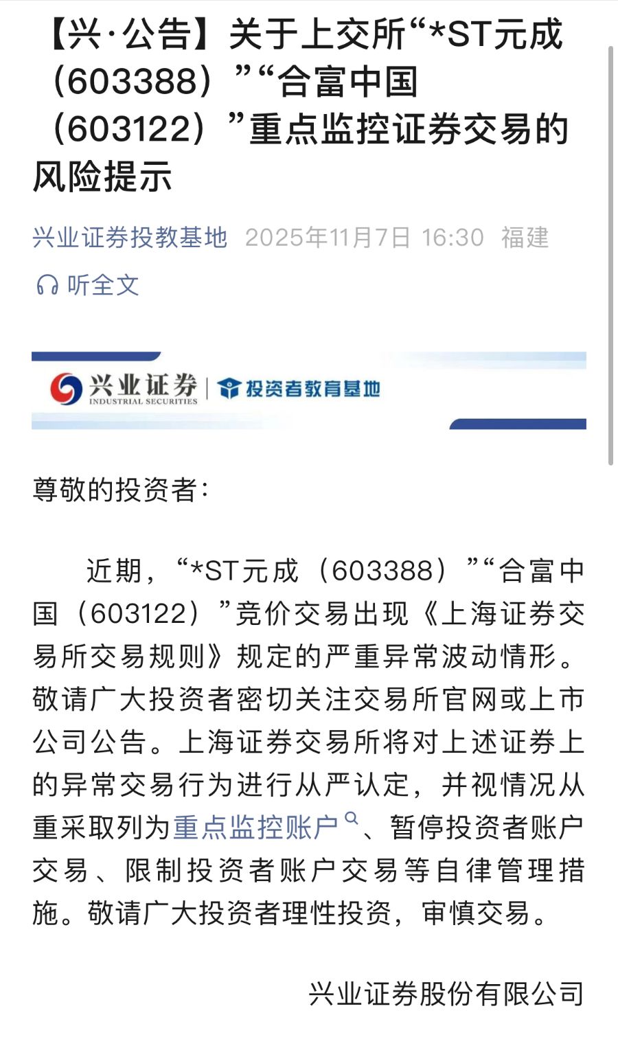 值得注意的是,当前合富中国的异常交易行为已引起监管机构的高度关注。11月7日盘后,多家券商披露,上海证券交易所已明确指出,“合富中国”等股票的交易情况已构成严重异常波动。后续,交易所将对其异常交易行为从严认定,并视情况从重采取列为重点监控账户、暂停投资者账户交易、限制投资者账户交易等自律管理措施。
