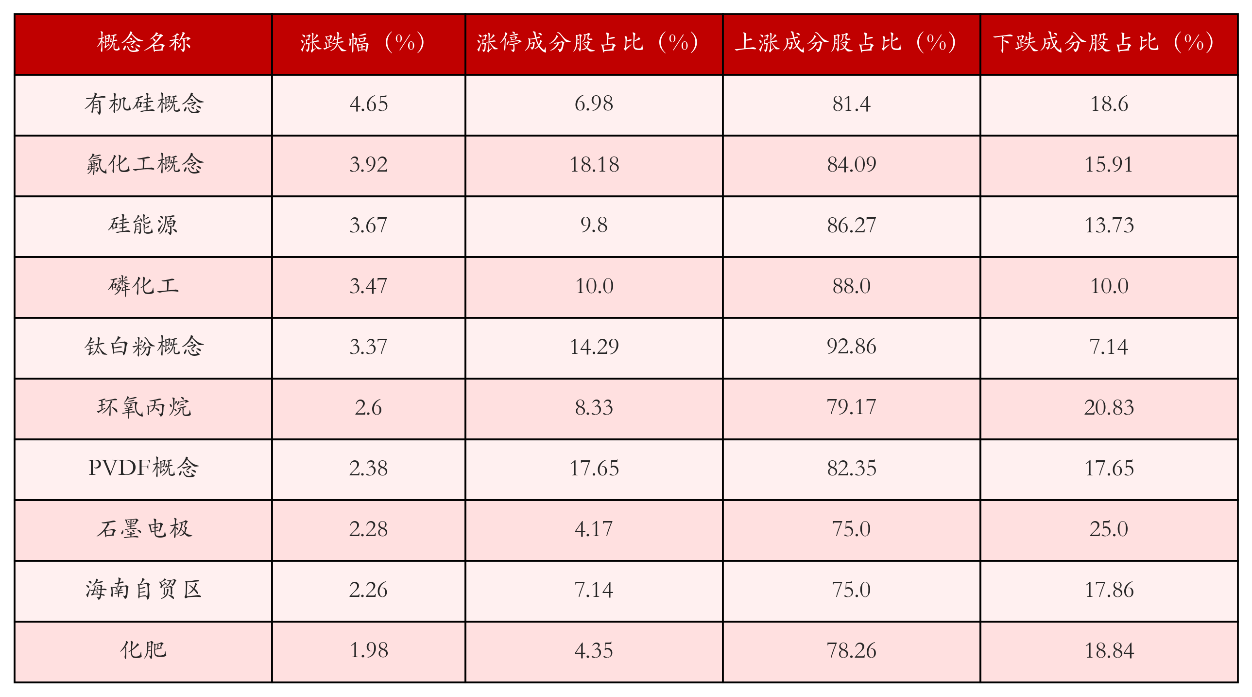 根据A股概念涨跌幅与所对应的股票池综合分析,涨幅靠前的三个概念板块分别为:有机硅概念、氟化工概念与硅能源。排名前10位的概念板块相关数据见下表: