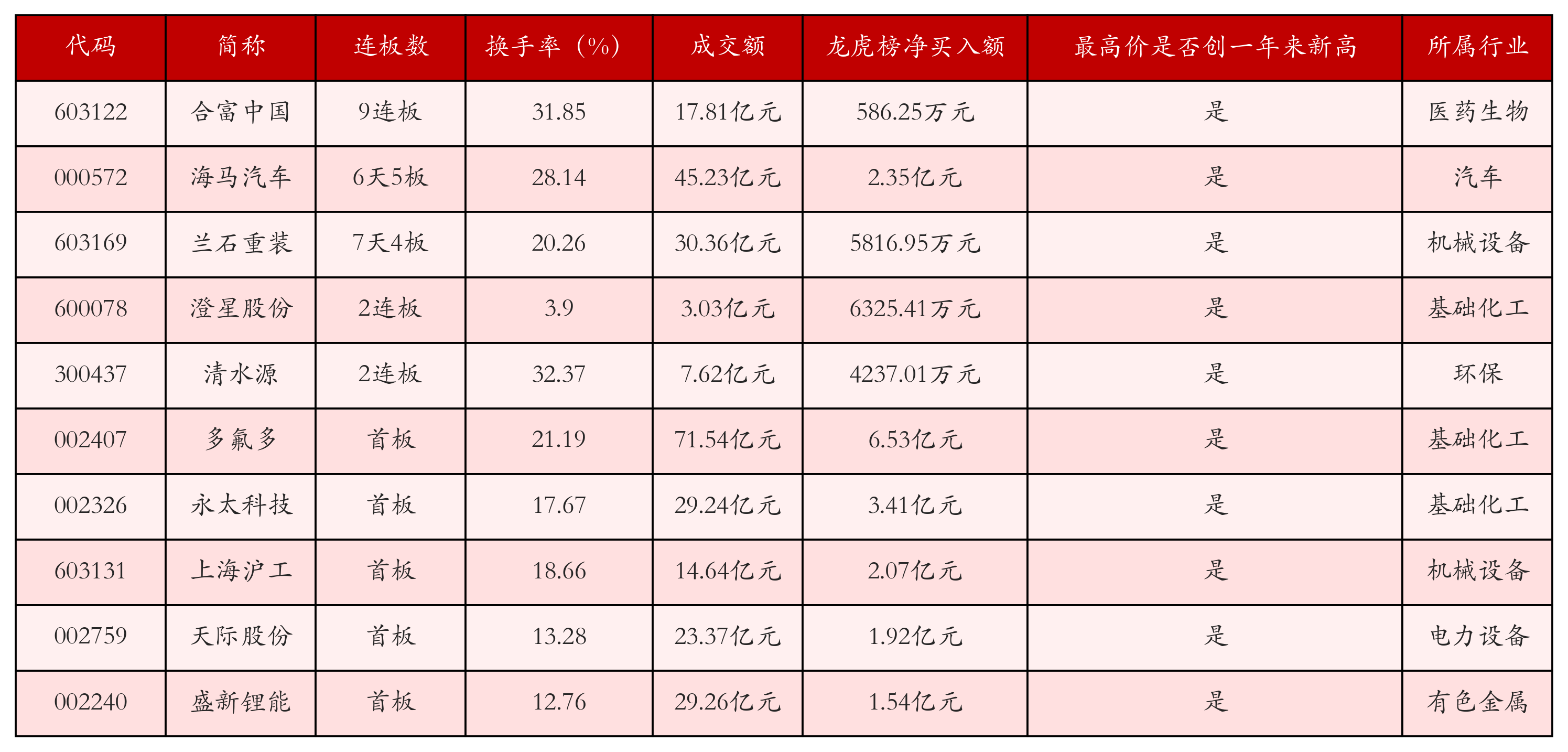 截至11月7日收盘,上证综指下跌0.25%,收于3997.56点,深证成指下跌0.36%,收于13404.06点,创业板指下跌0.51%,收于3208.21点。今日沪深两市A股共计64只涨停,综合当前连板数以及当日龙虎榜数据,其中较为强势的前三只个股分别为:合富中国(603122)、海马汽车(000572)与兰石重装(603169)。今日强势个股前10位具体数据见下表: