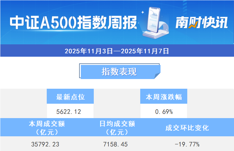 本周中证A500指数上涨0.69%,截至11月7日收盘,报5622.12点。本周日均平均成交额为7158.45亿元,单日成交额环比下降19.77%。
