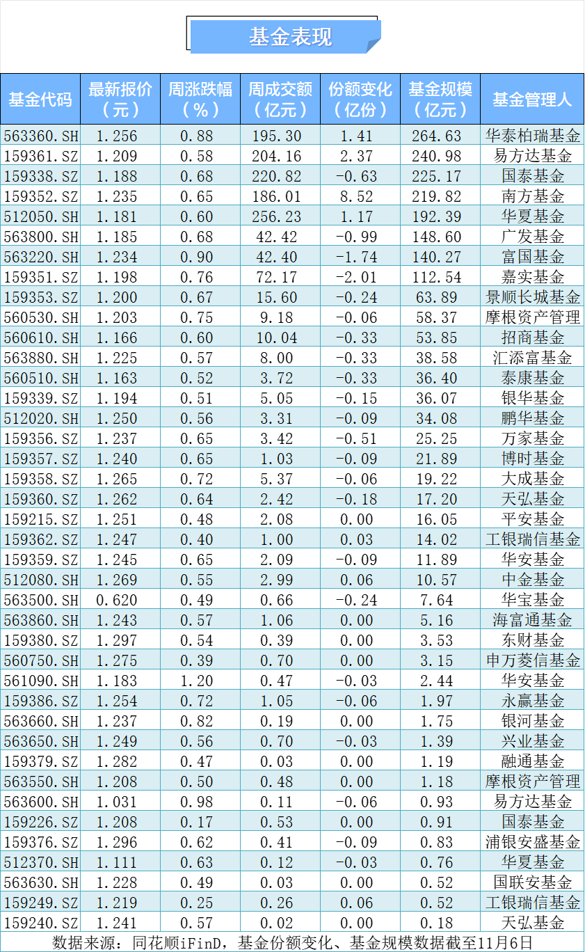 本周40只中证A500基金集体上涨,其中,华安基金的中证A500增强ETF周内上涨1.2%。此外,基金总规模再上2000亿元,规模前三为A500ETF华泰柏瑞、A500ETF易方达、国泰基金的中证A500ETF,分别为264.63亿元、240.98亿元、225.17亿元。