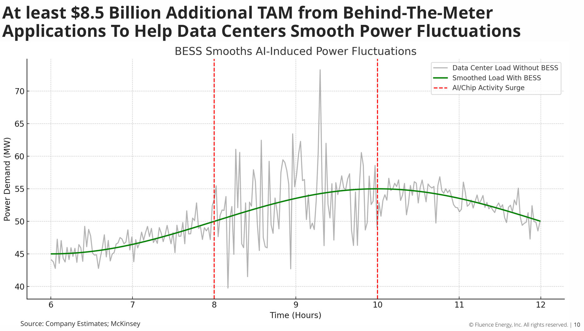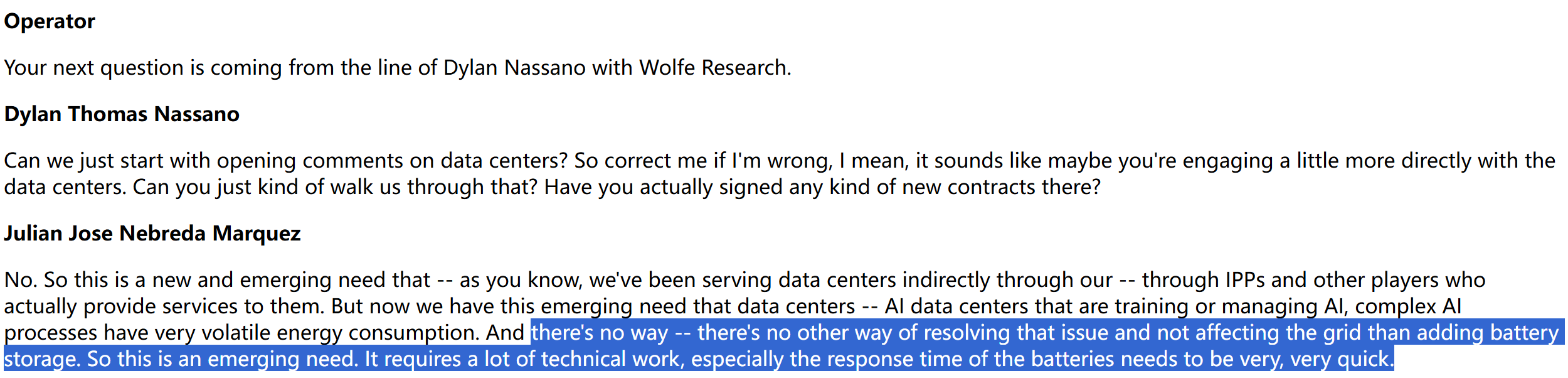 其实早在8月份Fluence Energy的earning call中,就已经给出了答案,电化学储能是唯一一个在不影响电网稳定性、或不依靠电网改造的前提下,能够解决AIDC缺电的最佳方案。