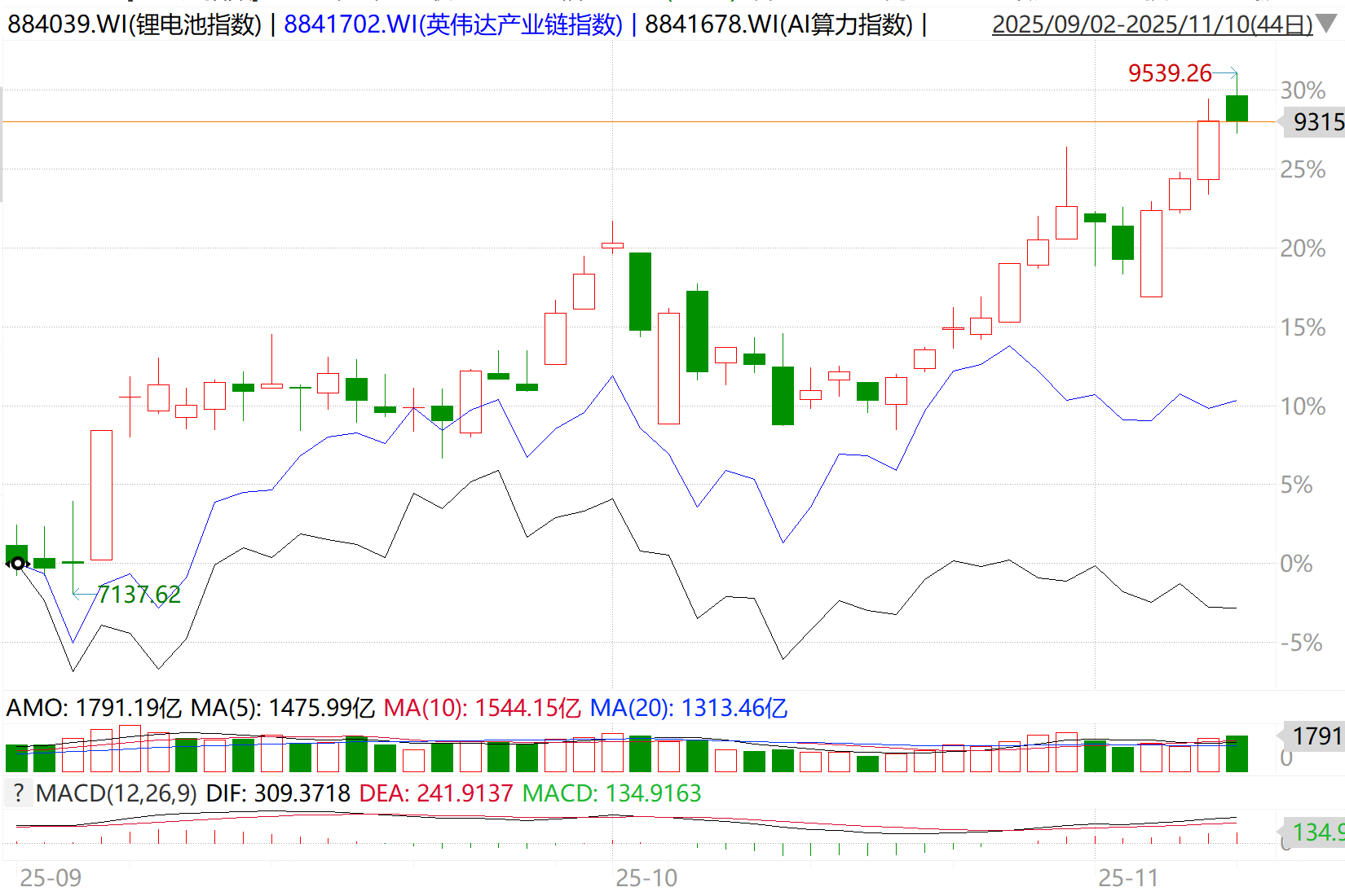 从9月底到11月10日收盘,储能产业链的确成为了市场的新主线,尤其是中游锂电池、锂电池材料、上游锂矿磷矿等,相比于英伟达产业链,超额收益非常显著。