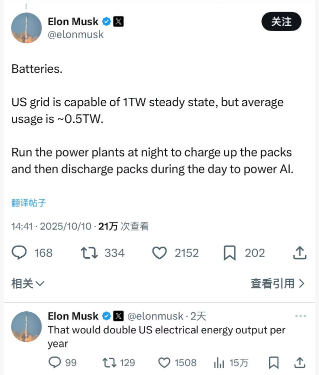 图片说明:马斯克早在10月初就给出了AIDC缺电解决方案,数据来源于推特