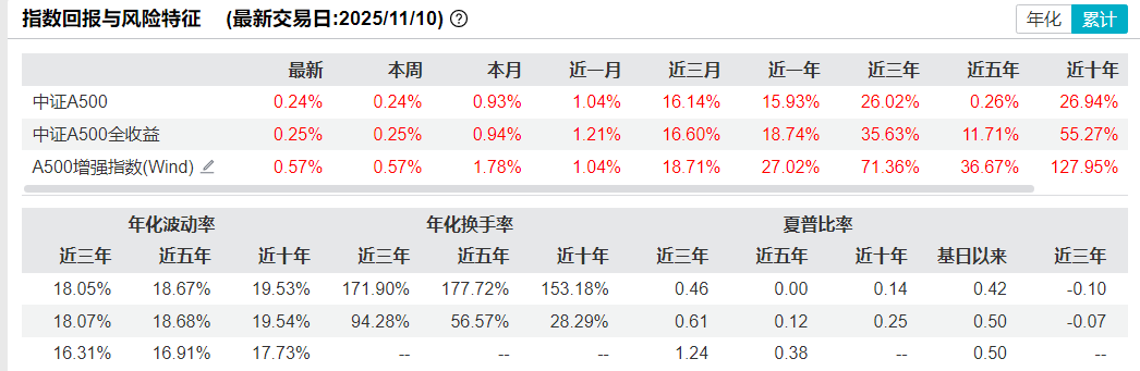 在市场的喧嚣与抉择的迷茫中,中证A500指数这一被誉为A股“新核心”的宽基指数,给出了兼顾收益与稳健的“最优解”。自2004年12月31日基日以来,穿越数轮牛熊转换,中证A500指数展现出了强大的生命力与韧性。截至2025年11月10日,其累计收益率高达463.54%,近十年年化波动率19.53%,夏普比率0.42,在收益增长与风险把控之间实现了精妙平衡。