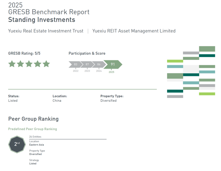 越秀房产基金在全球房地产可持续标准(GRESB)中首次荣膺最高五星评级和“全球行业领导者-上市企业(多元物业类别)”殊荣,并连续第五年获得公开披露最高A评级,显示其可持续发展领先地位。成功发行全球首单上市REITs熊猫债券,为可持续发展奠定坚实资本基础。
