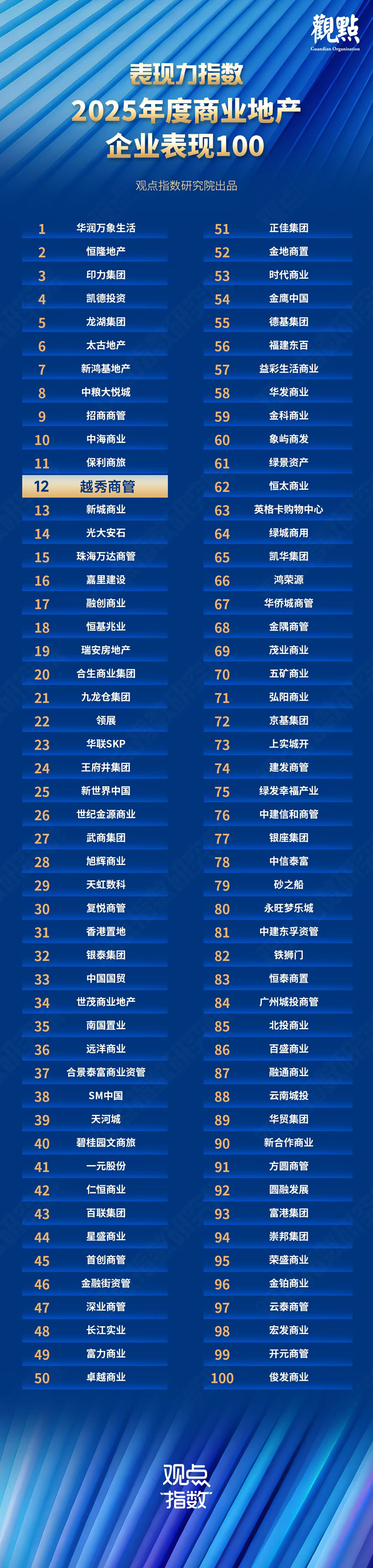 (原标题:越秀商管荣膺“2025年中国商业地产企业TOP100”第12位)