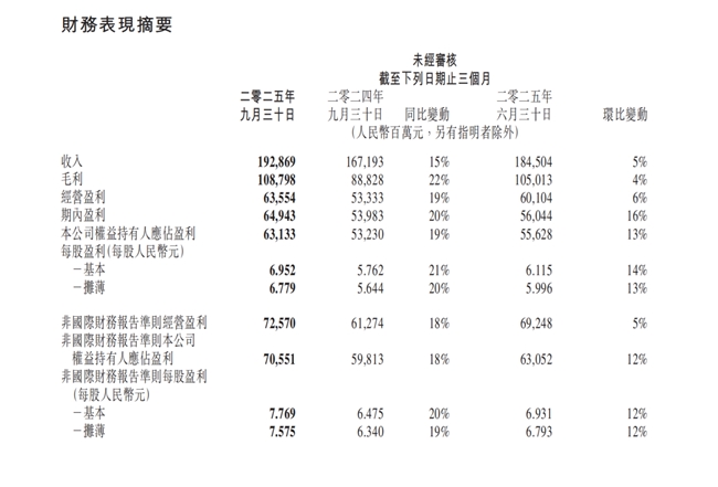 腾讯控股(00700.HK)11月13日发布2025年第三季度财报,当季腾讯实现营收1928.7亿元同比增长15%,经营利润(Non-IFRS)725.7亿元同比增长18%,经营利润增速持续高于营收增速并超市场普遍预期。