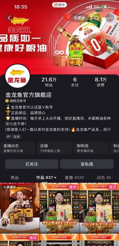 目前,金龙鱼已在快手实现全域经营深度布局,通过达播、短带、自播、商城等多场域发力,带动生意全域协同增长,月均同比达两位数增长。
