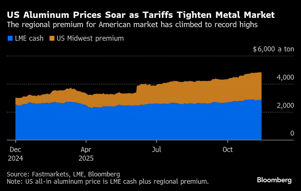 而力拓集团近期对美国市场铝出口征收的附加费,更是在此基础上形成了“溢价之上的溢价”。美国买家实际支付的铝价中,附加成本高达每吨2006美元,相当于基准价的70%以上,远超出政府征收的50%关税水平。