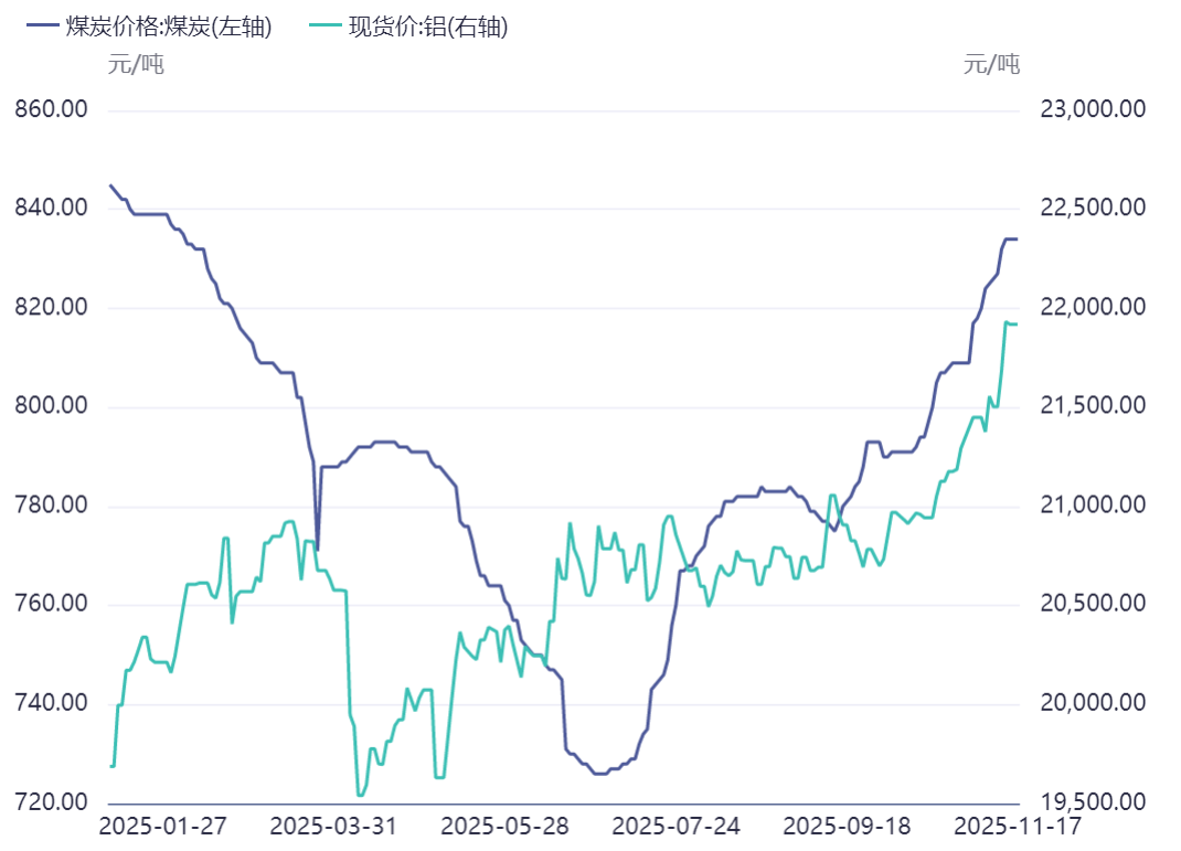图片说明:今年以来煤炭和电解铝价格走势,数据来源于同花顺