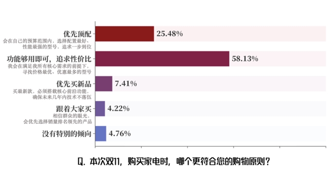 目前中国家电市场已高度饱和,市场进入换新需求驱动的阶段。在这样的大背景下,今年双11家电消费呈现出显著的结构分化特征。《2025年双11家电市场消费调研》显示,今年双11家电消费在用户结构上分化明显,“务实族”与“顶配族”两种截然不同的消费理念并行。其中“务实族”仍为主流,占比58.13%,他们坚持“功能够用即可”,在满足核心需求的前提下追求极致性价比。25.48%的消费者则是坚定的“顶配族”,他们认为家电大多是长周期使用产品,应在预算范围内选择配置最好、性能最强的型号,追求一步到位。