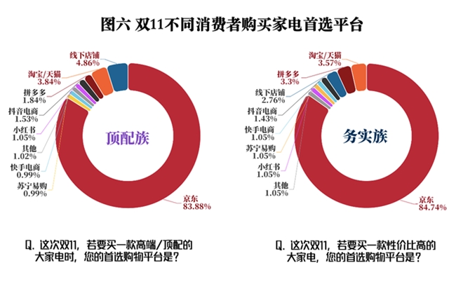 调查数据显示,在平台选择上,多样化供给和优秀的综合服务能力,使京东成为不同类型消费者的首选。对优先购买高端/顶配大家电的“顶配族”,83.88%的受访者首选京东购买家电,认可其“家电消费主场,新品大牌首发和品质信赖”的定位,排名其后的是线下渠道,具备“可实地体验”的优势,以及淘宝/天猫,以“活动广、品牌选择多”的特点吸引消费者。而对购买高性价比大家电的“务实族”,京东仍是84.73%的受访者的首选,认为其“补贴直给、型号齐全、服务可靠”;排名其后的是淘宝/天猫和拼多多。