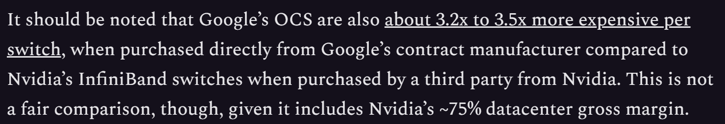 由于谷歌尚未对外销售OCS,关于OCS的成本并无公开信息可以参考,为此,半导体专业分析机构SemiAnalysis专门写了一篇分析谷歌AI数据中心的论文《Google AI Infrastructure Supremacy: Systems Matter More Than Microarchitecture》,并在论文中明确提到了:相比于直接从英伟达那里购买InfiniBand,直接从谷歌的合约制造商那里购买OCS交换机,成本要高出3.2倍~3.5倍。