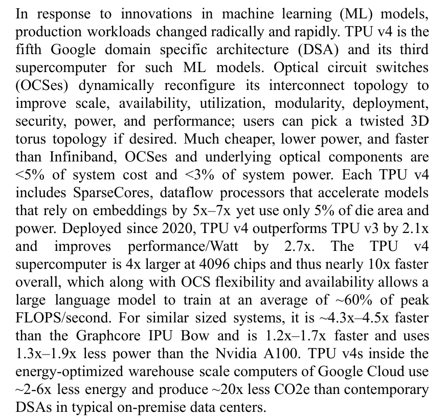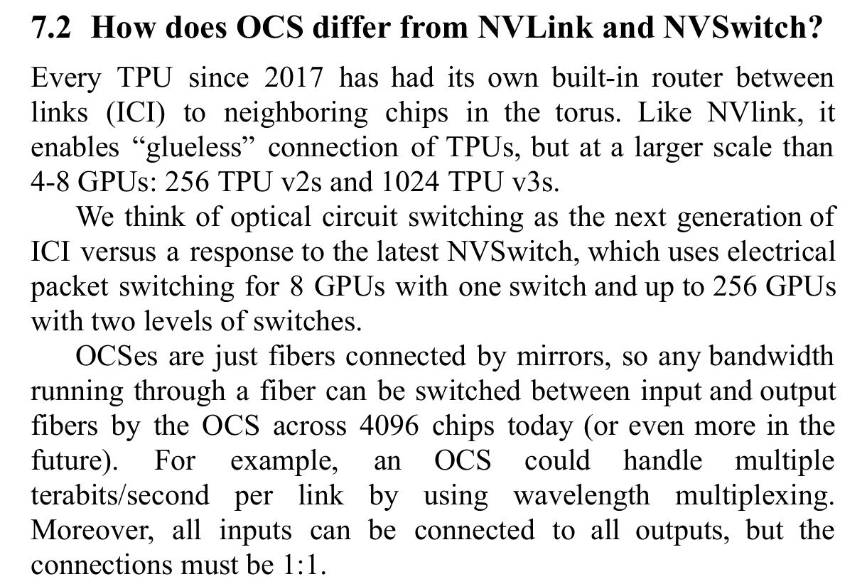 谷歌曾于2023年在ISCA上发表论文《TPUv4: An Optically Reconfigurable Supercomputer for Machine Learning with Hardware Support for Embeddings》,这篇论文是关乎谷歌TPU和OCS信息最全面的一篇文章,有关于谷歌数据中心的架构、TPU与OCS的比例、甚至OCS与英伟达NVLink和NVSwitch的对比都有涉及,是研究谷歌产业链必读的文章。