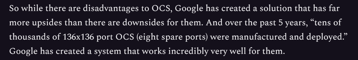 SemiAnalysis曾于2023年3月发布报告《Google OCS Apollo: The >$3 Billion Game-Changer in Datacenter Networking》,在文中明确指出,在过去五年中,谷歌已经部署了数万台136x136端口的OCS。