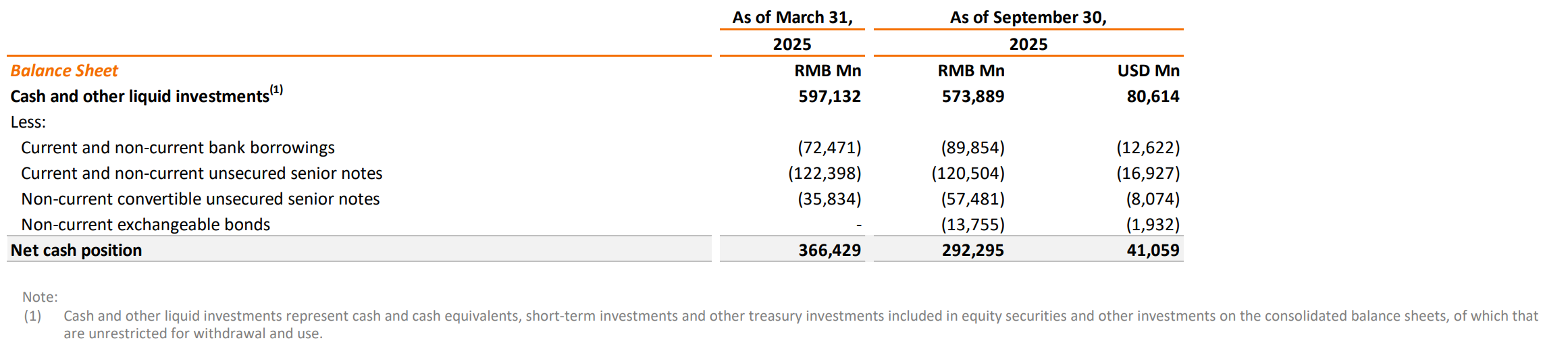 图片说明:阿里巴巴截止到2025年三季度的净现金,数据来源于阿里巴巴财报