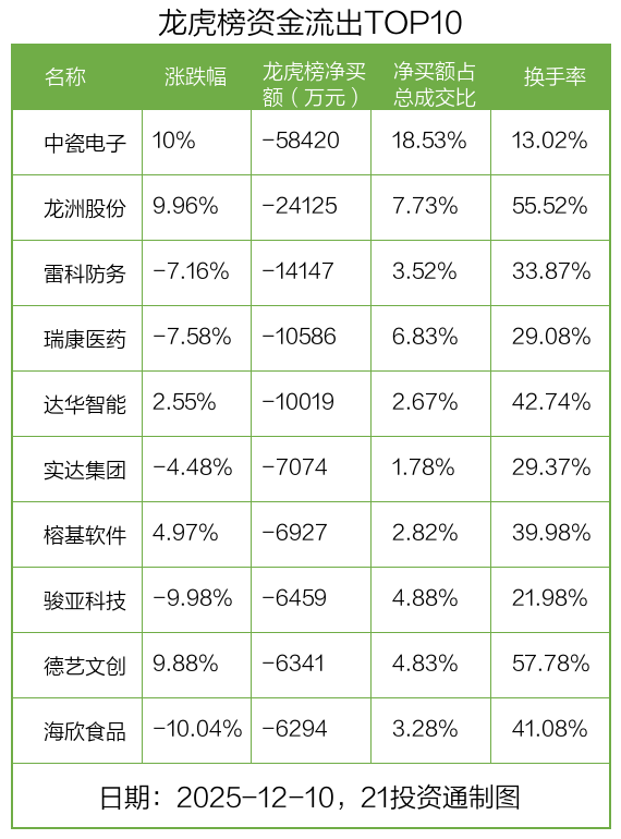 而龙虎榜中资金净流出最多的是中瓷电子(003031.SZ),被净卖出为5.84亿元,占总成交金额的18.53%。中瓷电子收盘上涨10%,换手率为13.02%。