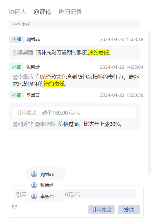 合同文本草拟阶段,经办人可以同时邀请内部人员和外聘律师对文本进行协同编辑和评审。协同过程中各协同人可以方便地引用合同原文内容@其他协同人,大家共同对有疑问的地方进行沟通讨论。支持多轮协同。