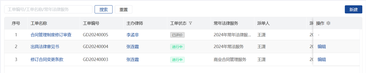 在常法框架合同下,支持在线给外聘律师派发任务工单,每个工单均可在线反馈成果,与内部法务沟通,完成工单派发、任务执行、工时确认、服务评价管理闭环。