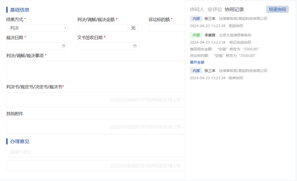 支持诉讼代理律师在线反馈案件进展、上传法院判决文书,经办人确认后即可完成案件进展情况更新,直接降低内部法务数据录入填报工作量。