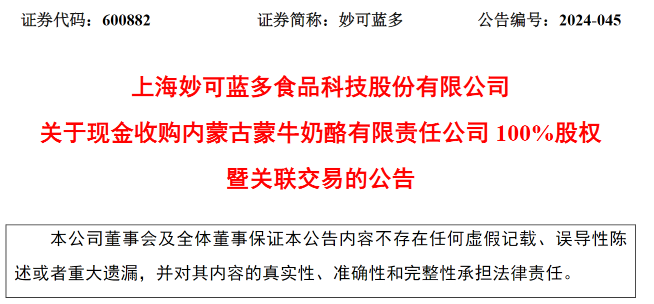 图片说明:妙可蓝多现金收购内蒙古蒙牛奶酪有限责任公司100%股权,数据来源于公告