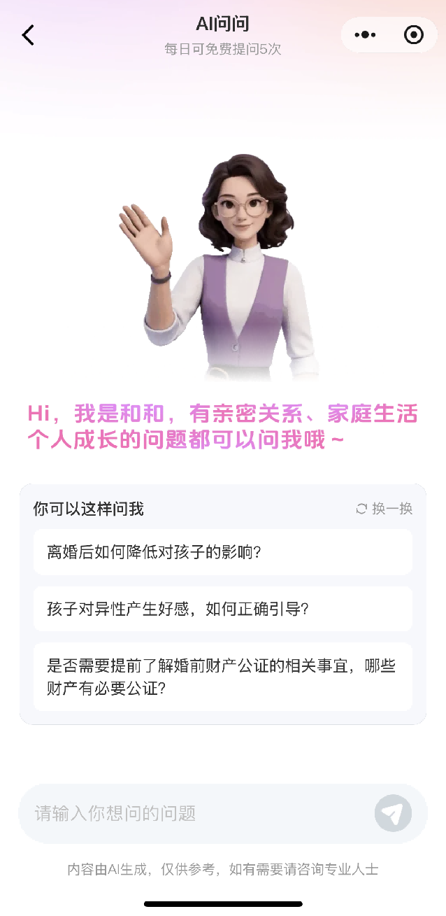 “永远在线”的陪伴:“和和”实现了7×24小时不间断服务,随时响应用户在情感、婚姻、家庭中遇到的困惑、压力或瞬间的情绪波动,成为触手可及的“随身情感顾问”,弥补了传统咨询在时间和可及性上的不足。