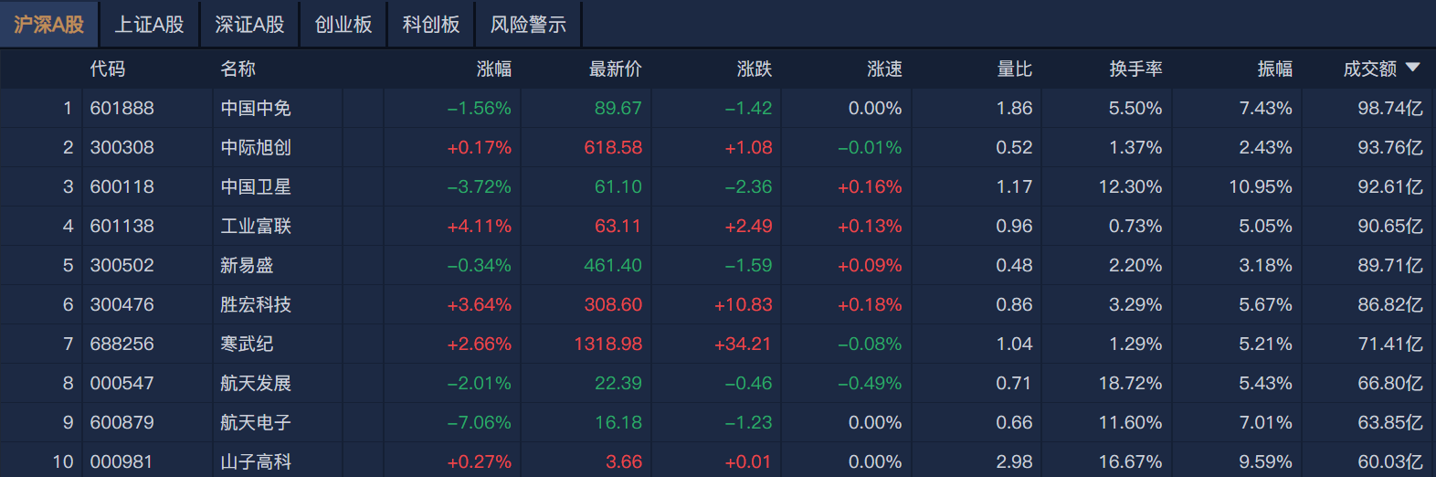 个股方面,中国中免成交额超98亿元居首,中际旭创、中国卫星、工业富联成交额靠前。
