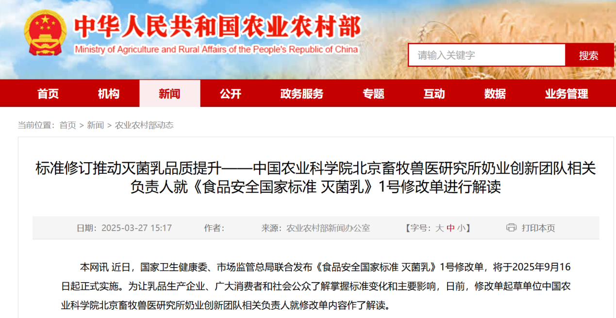 图片说明:关于《食品安全国家标准 灭菌乳》1号修改单的解读,数据来源于农业农村部官网