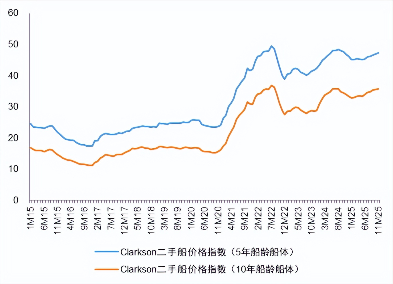 图片说明:二手船价格指数,数据来源于克拉克森