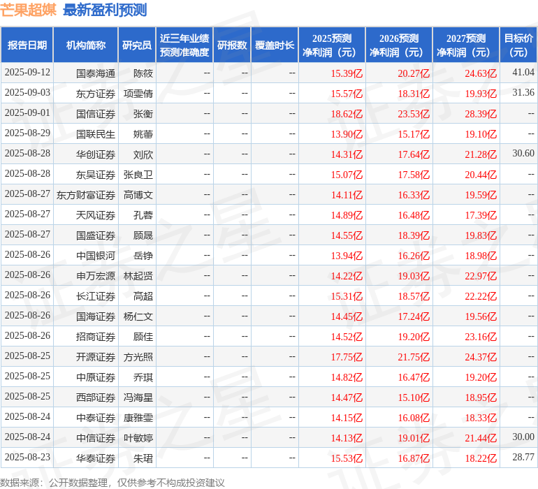 芒果超媒2025年中报显示,公司主营收入59.64亿元,同比下降14.31%;归母净利润7.63亿元,同比下降28.31%;扣非净利润6.1亿元,同比下降33.15%;其中2025年第二季度,公司单季度主营收入30.63亿元,同比下降15.74%;单季度归母净利润3.85亿元,同比下降35.09%;单季度扣非净利润3.06亿元,同比下降31.18%;负债率29.91%,投资收益1.27亿元,财务费用-274.43万元,毛利率26.56%。