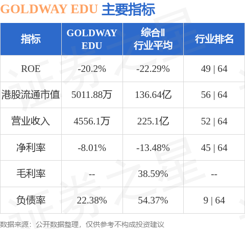 GOLDWAY EDU港股市值5011.88万港元,在综合Ⅱ行业中排名第56。主要指标见下表: