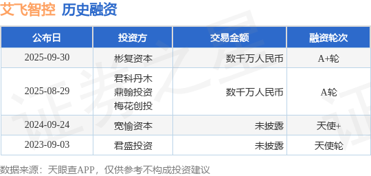 证券之星消息,根据天眼查APP于9月30日公布的信息整理,深圳市艾飞智控科技有限公司A+轮融资,融资额数千万人民币,参与投资的机构包括彬复资本。