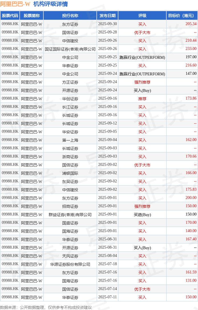 截至2025年10月9日收盘,阿里巴巴-W(09988.HK)报收于173.3港元,下跌2.42%,成交量1.58亿股,成交额276.16亿港元。投行对该股的评级以买入为主,近90天内共有23家投行给出买入评级,近90天的目标均价为174.99港元。中金公司最新一份研报给予阿里巴巴-W跑赢行业(OUTPERFORM)评级,目标价197港元。