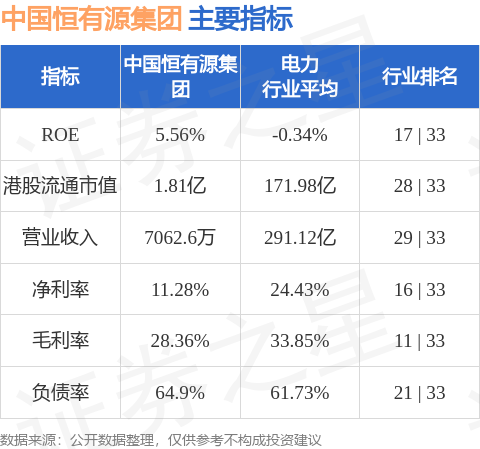 中国恒有源集团港股市值1.81亿港元,在电力行业中排名第28。主要指标见下表: