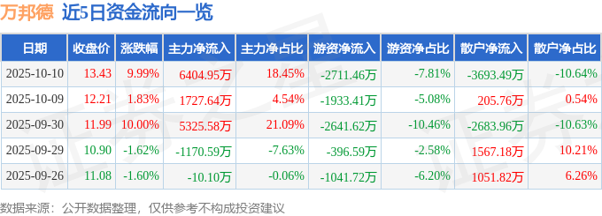 证券之星消息,万邦德10月10日涨停收盘,收盘价13.43元。该股于10点29分涨停,未打开涨停,截止收盘封单资金为6338.78万元,占其流通市值0.85%。