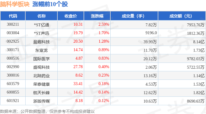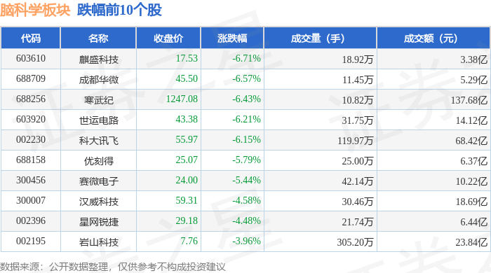 证券之星消息,10月10日脑科学板块较上一交易日下跌4.61%,麒盛科技领跌。当日上证指数报收于3897.03,下跌0.94%。深证成指报收于13355.42,下跌2.7%。脑科学板块个股涨跌见下表: