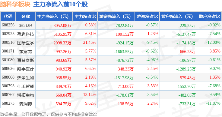 从资金流向上来看,当日脑科学板块主力资金净流出23.07亿元,游资资金净流入5.57亿元,散户资金净流入17.5亿元。脑科学板块个股资金流向见下表: